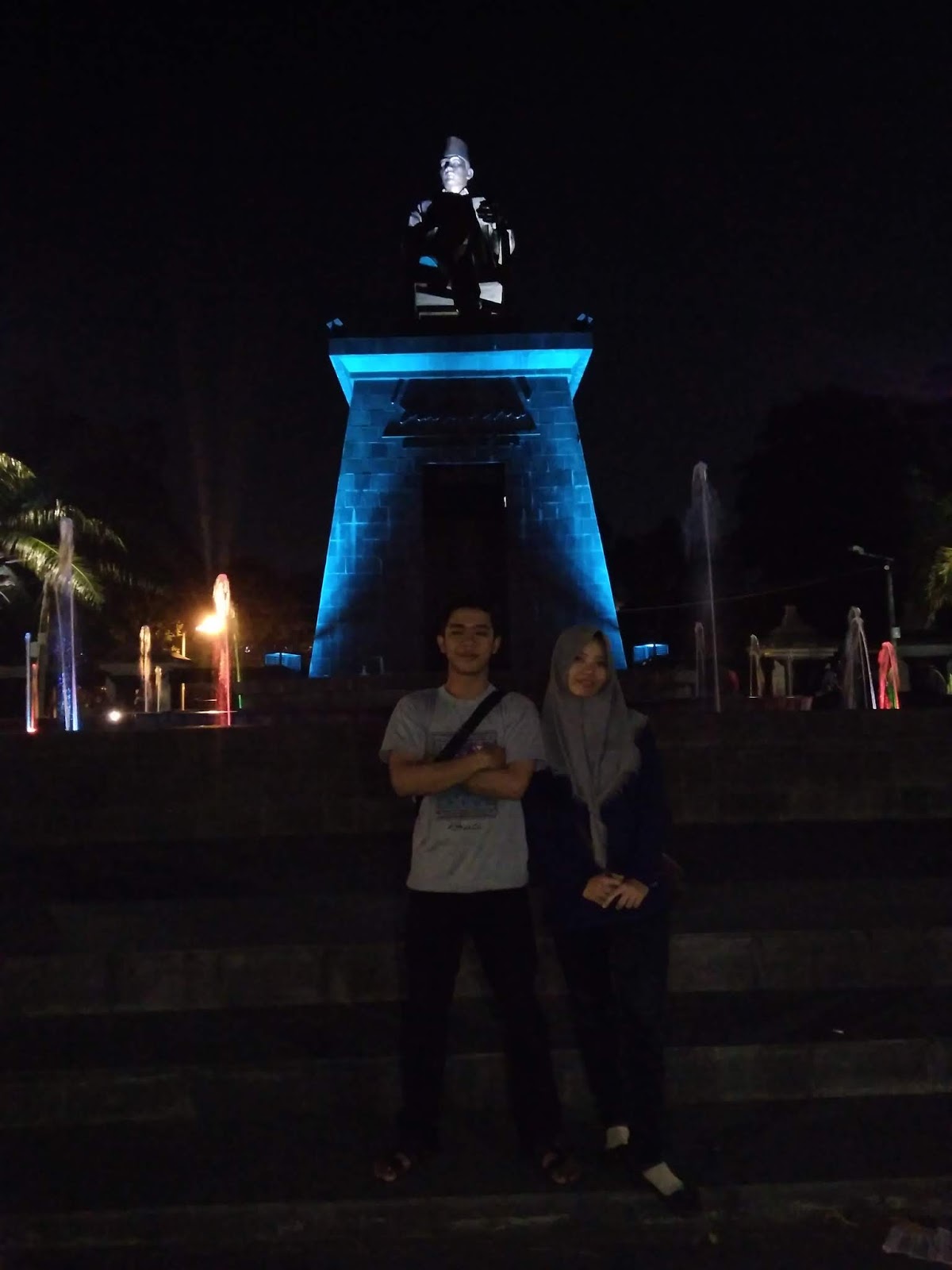 menikmati minumannya, kami pindah tempat. Masih di daerah Manahan, kami ke Stadion Manahan Solo. Letaknya tidak jauh dari tempat beli wedang tadi. Di sana ada patung Soekarno, berdiri di antara air mancur dan lampu warna-warni. Juga